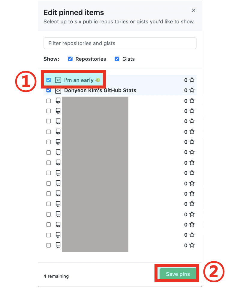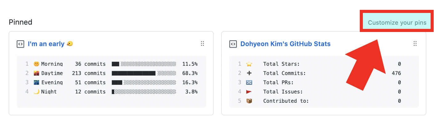 1. ์์ ์ GitHub ํ๋กํ → Pinned → Customize your pins ๋๋ฅด๊ธฐ