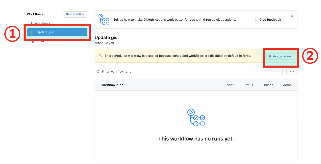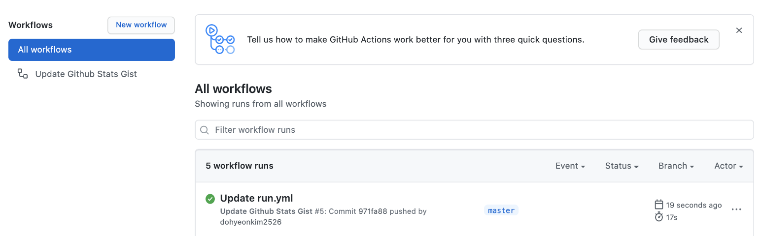 1. ์๋จ ๋ฉ๋ด์ ์๋ Actions ํด๋ฆญ > ๋ น์ ๋ฒํผ 'I understand my workflows,...' ๋๋ฆ